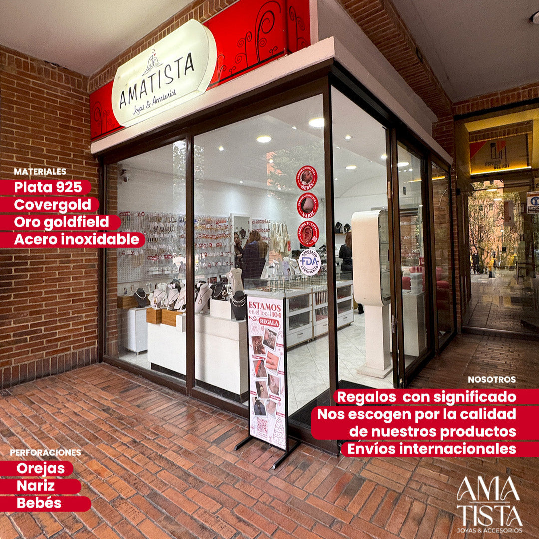 Encuéntranos en el Parque Central Bavaria, Local 104, en el corazón de Bogotá. Aquí podrás descubrir personalmente la calidad de nuestras joyas en plata 925, oro golfi y acero inoxidable, además de recibir asesoría directa y probar tus accesorios favoritos antes de llevártelos