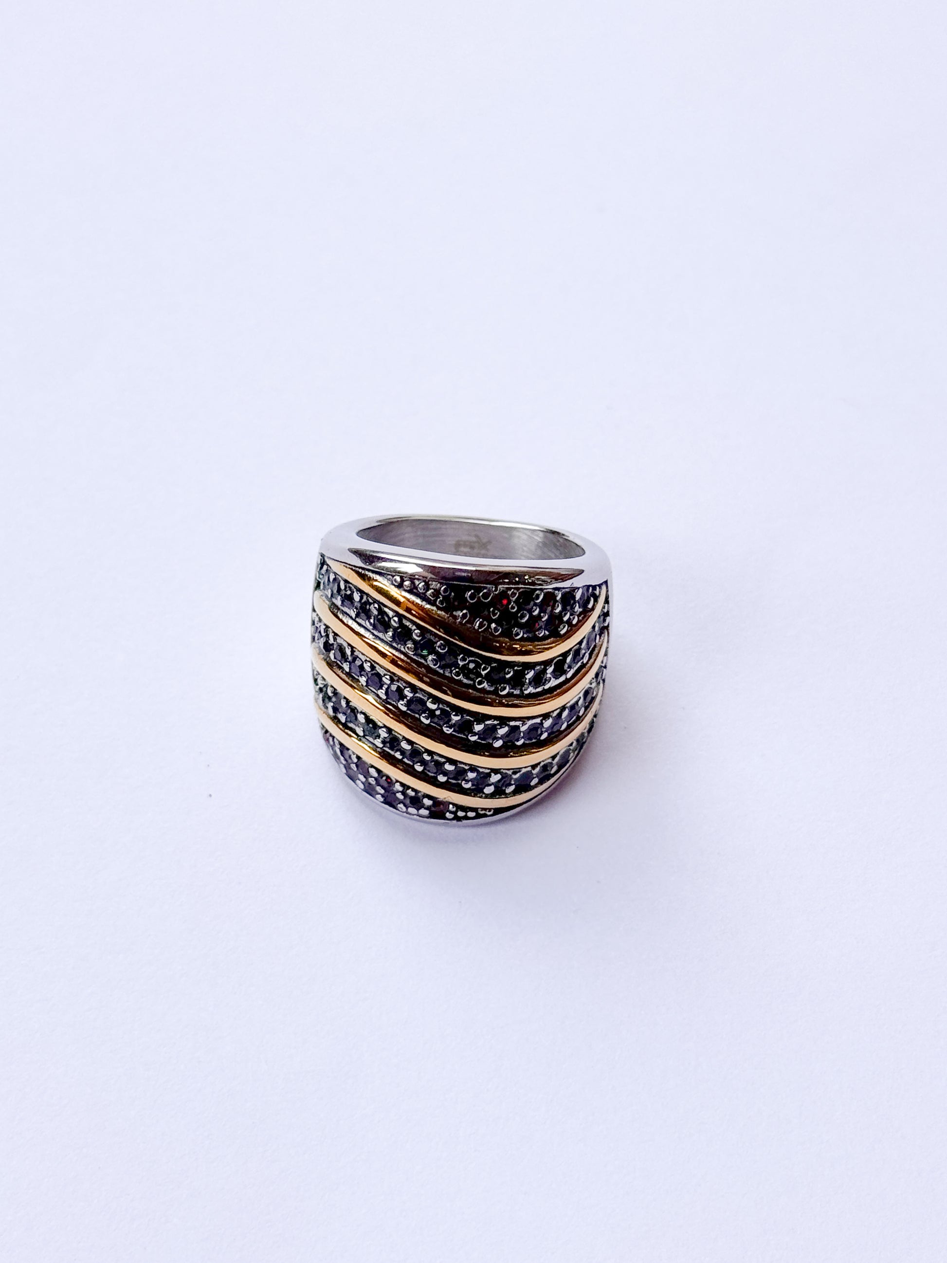 Anillo acero inoxidable dorado con detalles dorado, textura envejecida y brillantes multicolor