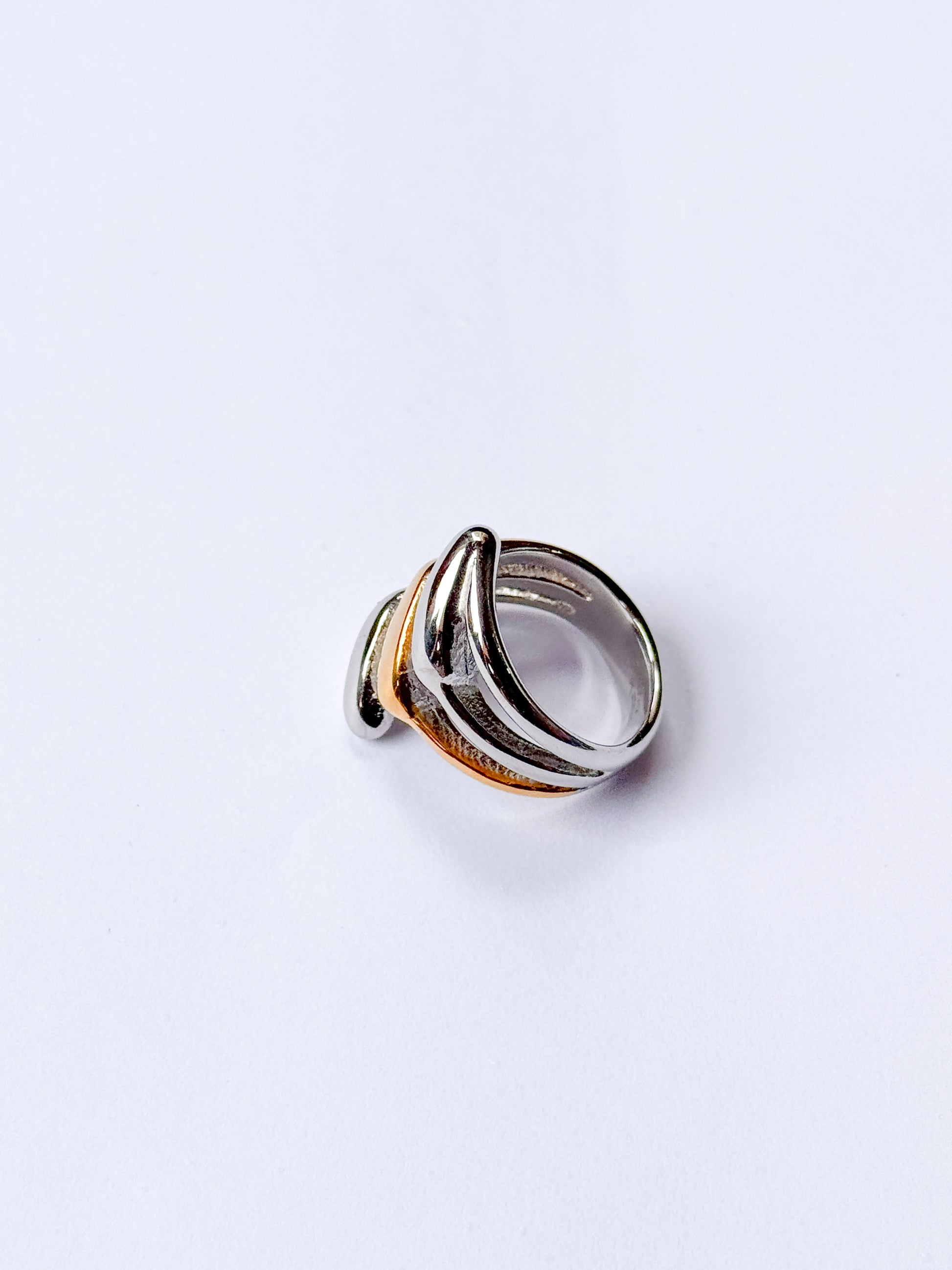 Anillo acero inoxidable dos oros plateado y dorado con diseño entrelazado