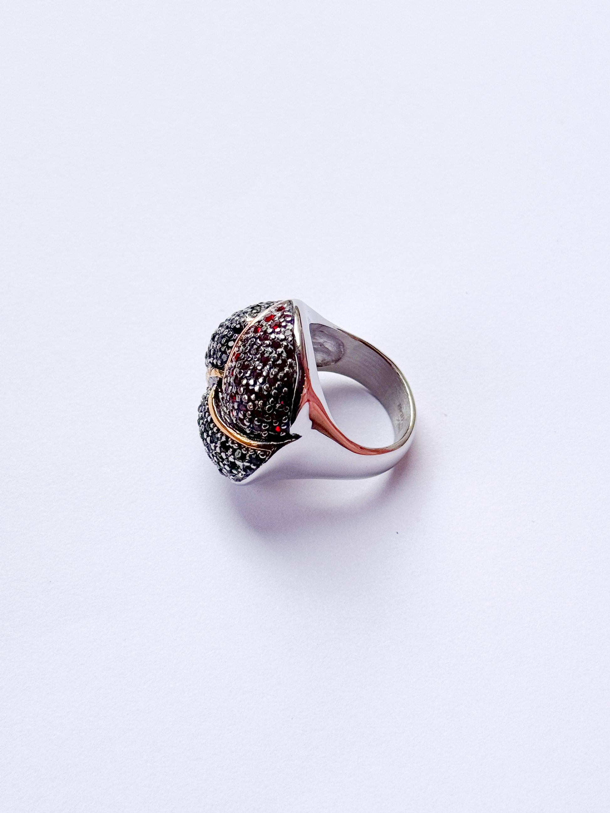 Anillo acero inoxidable dos oros, dorado y plateado de esfera con detalles envejecidos, brillantes negro, verde y rojo, enmarcado en dorado