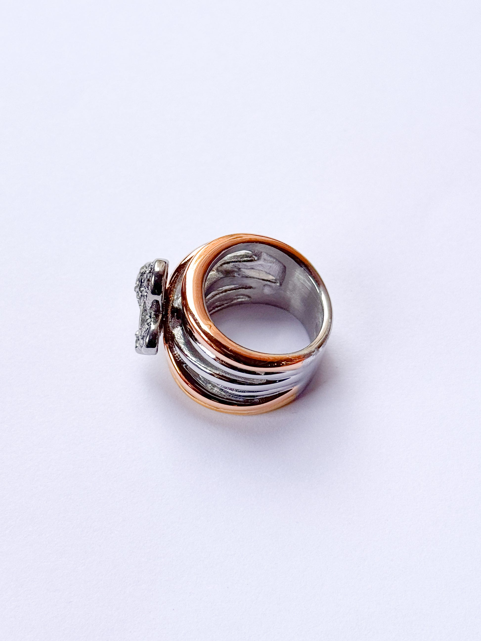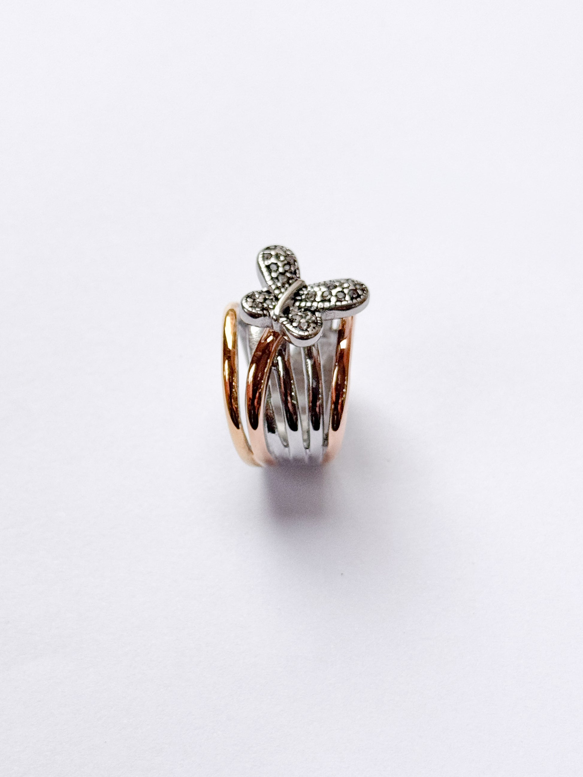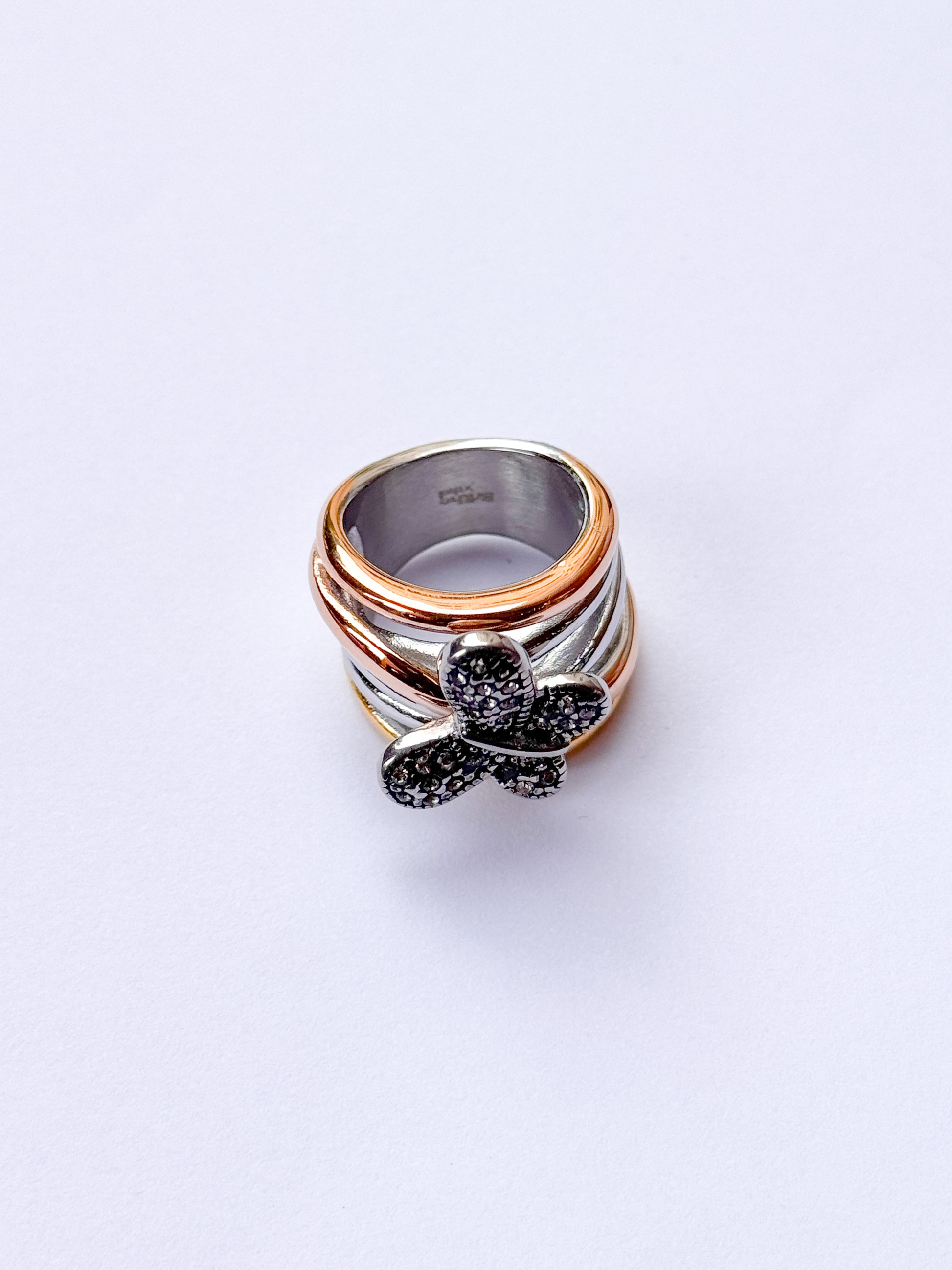 Anillo acero inoxidable dos oros plateado y dorado, en forma de mariposa con detalles de plata envejecida y brillantes