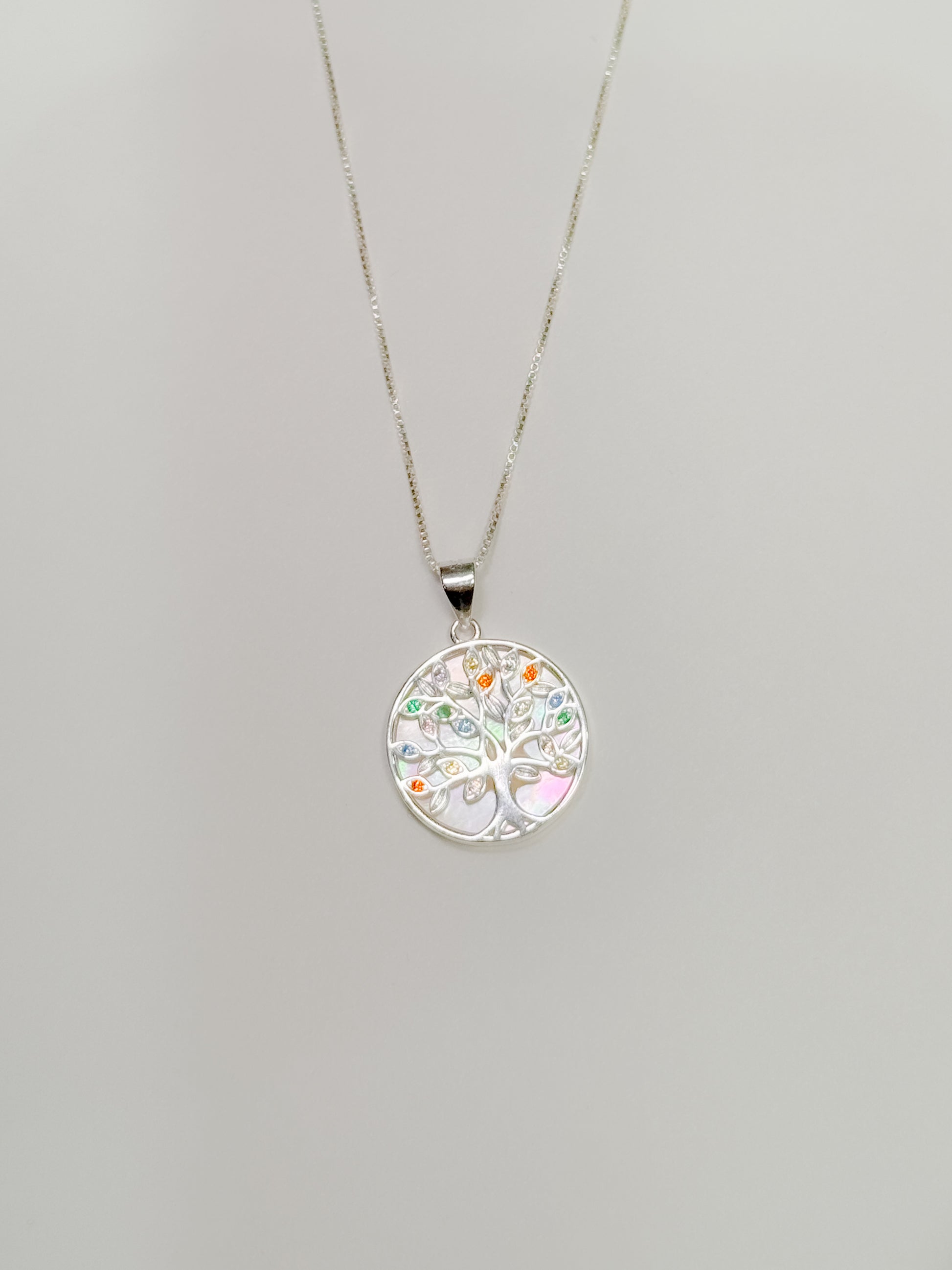Cadena veneciana con dije en nácar del árbol de la vida con brillantes multicolor