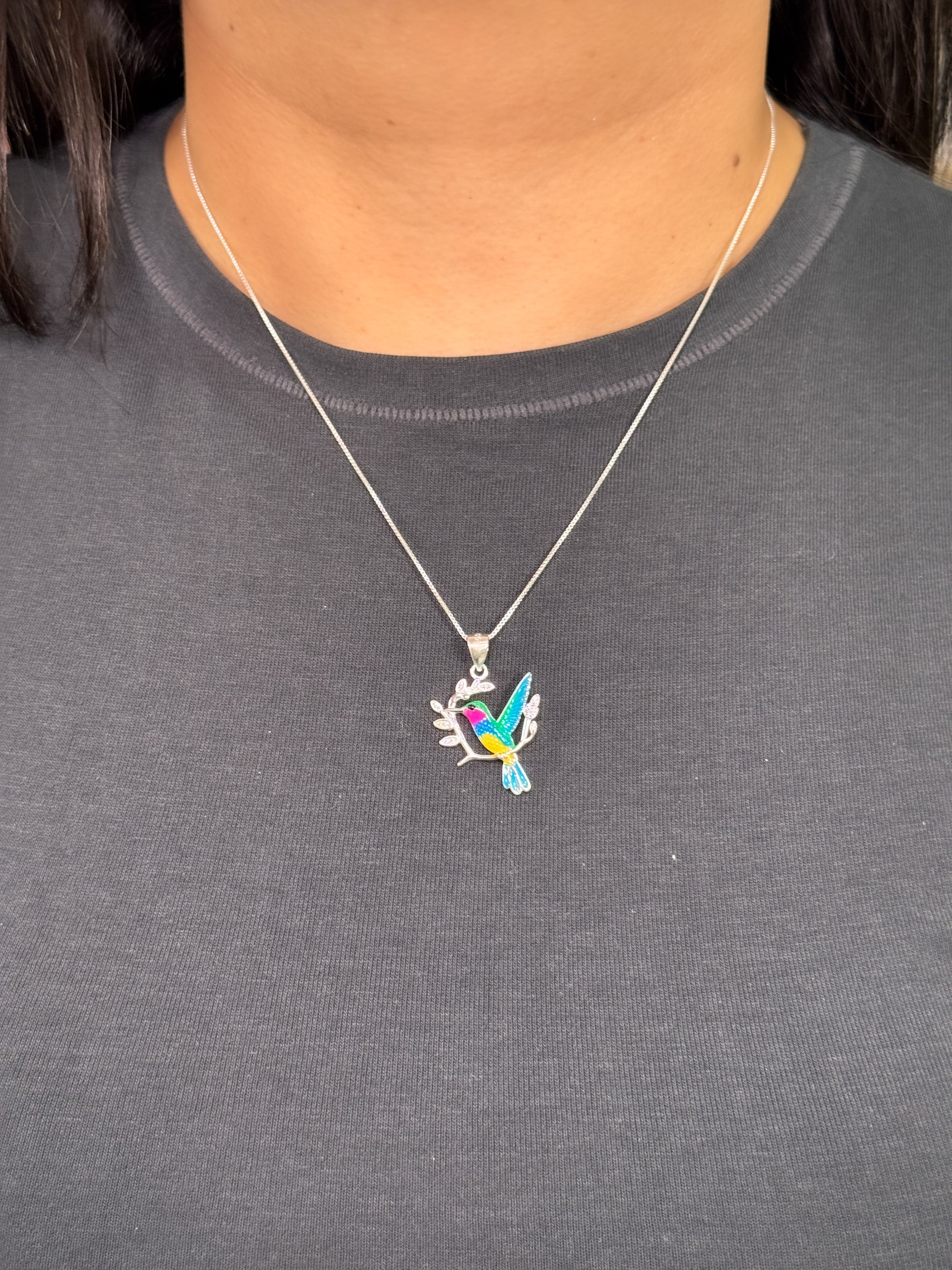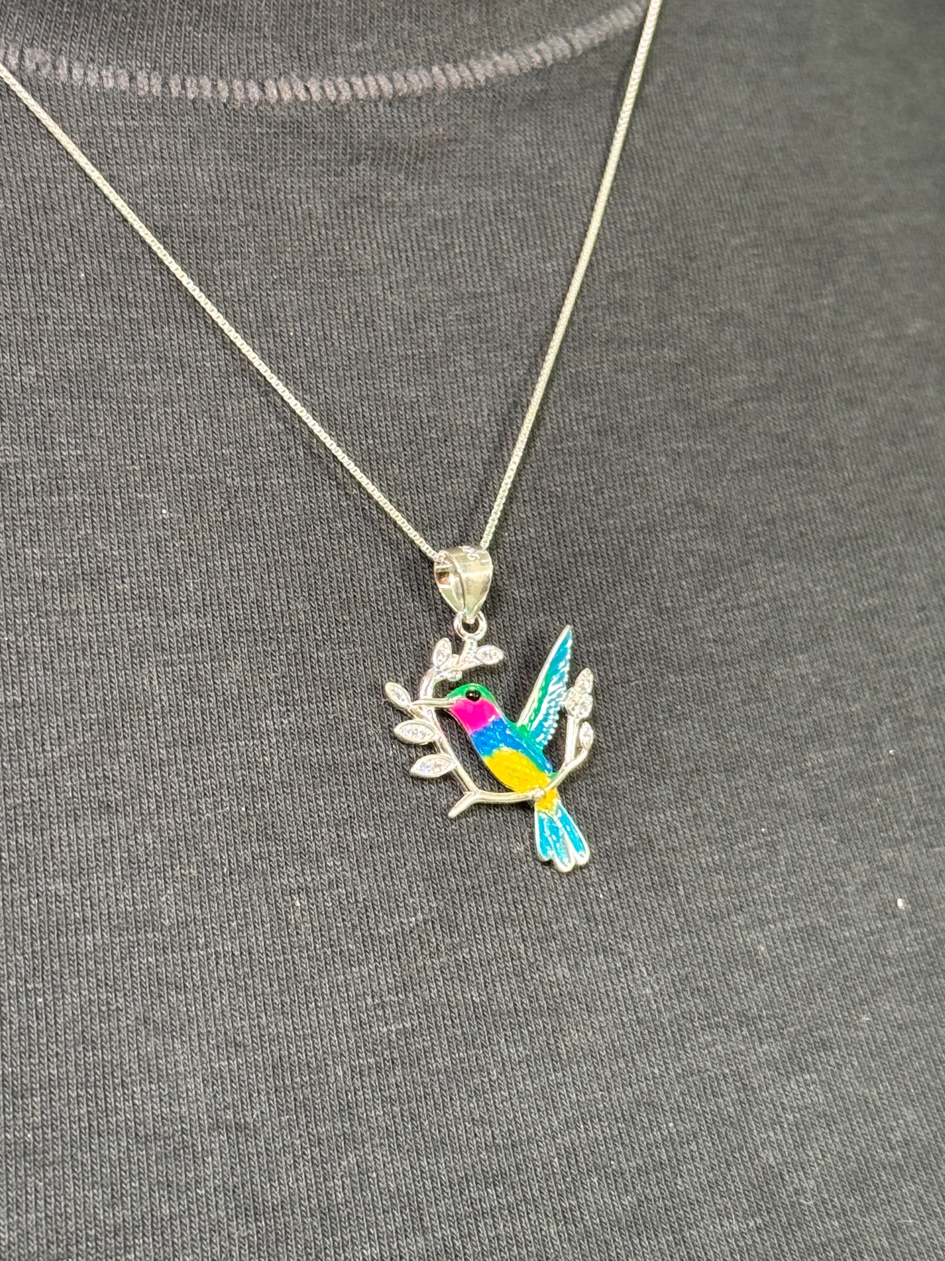 Cadena veneciana de 45cm, con dije de colibrí esmaltado en ramas brillantes