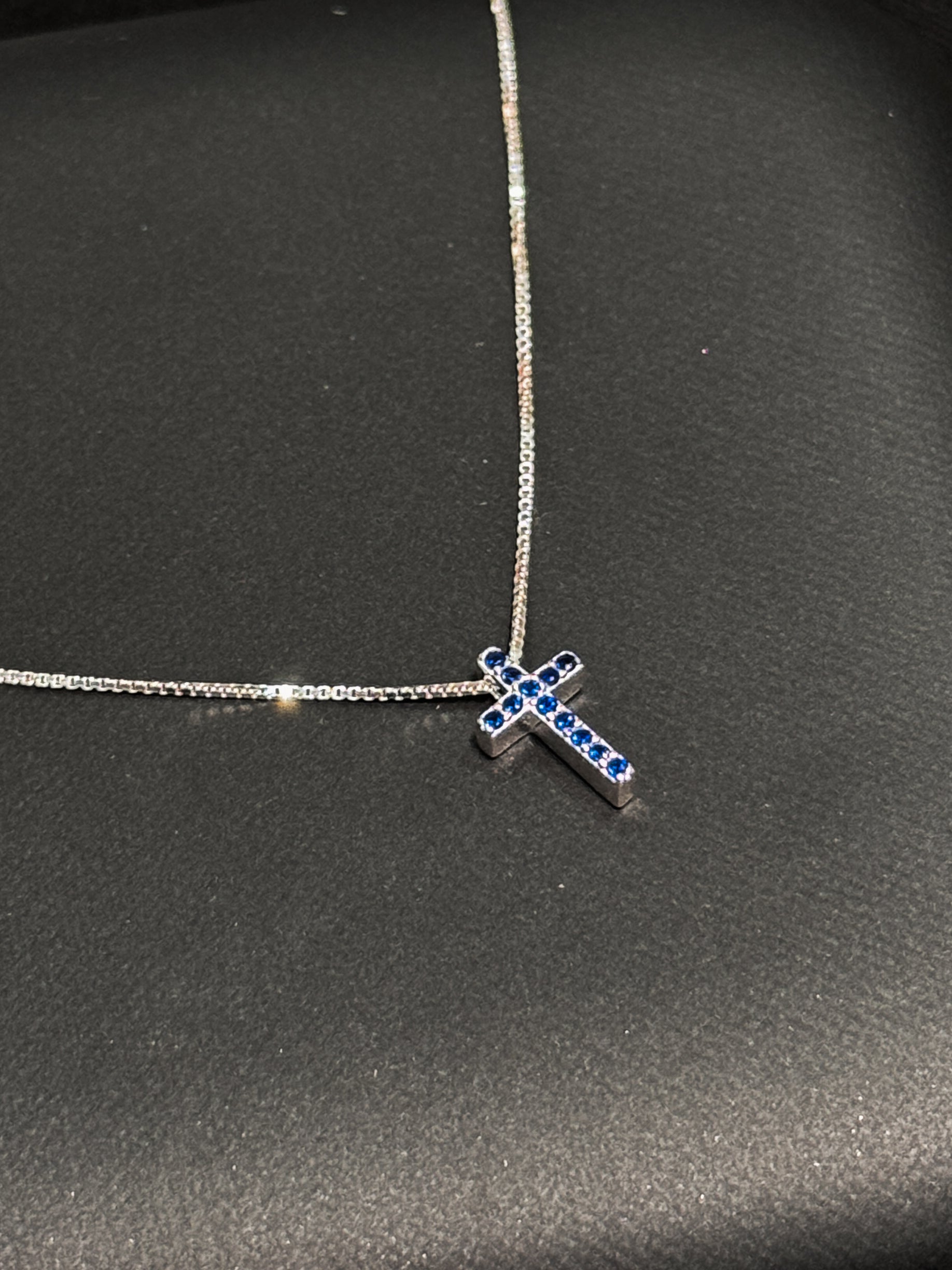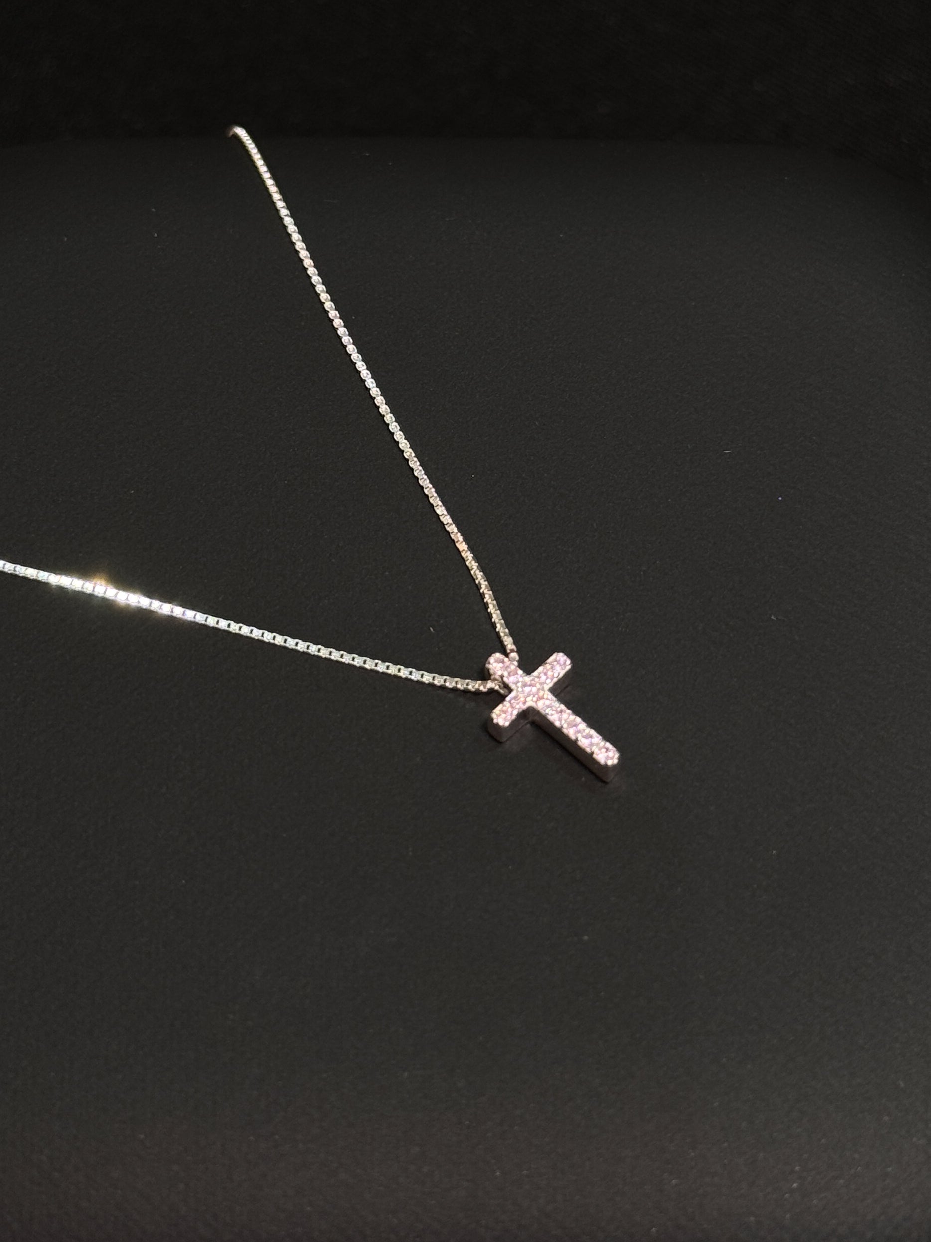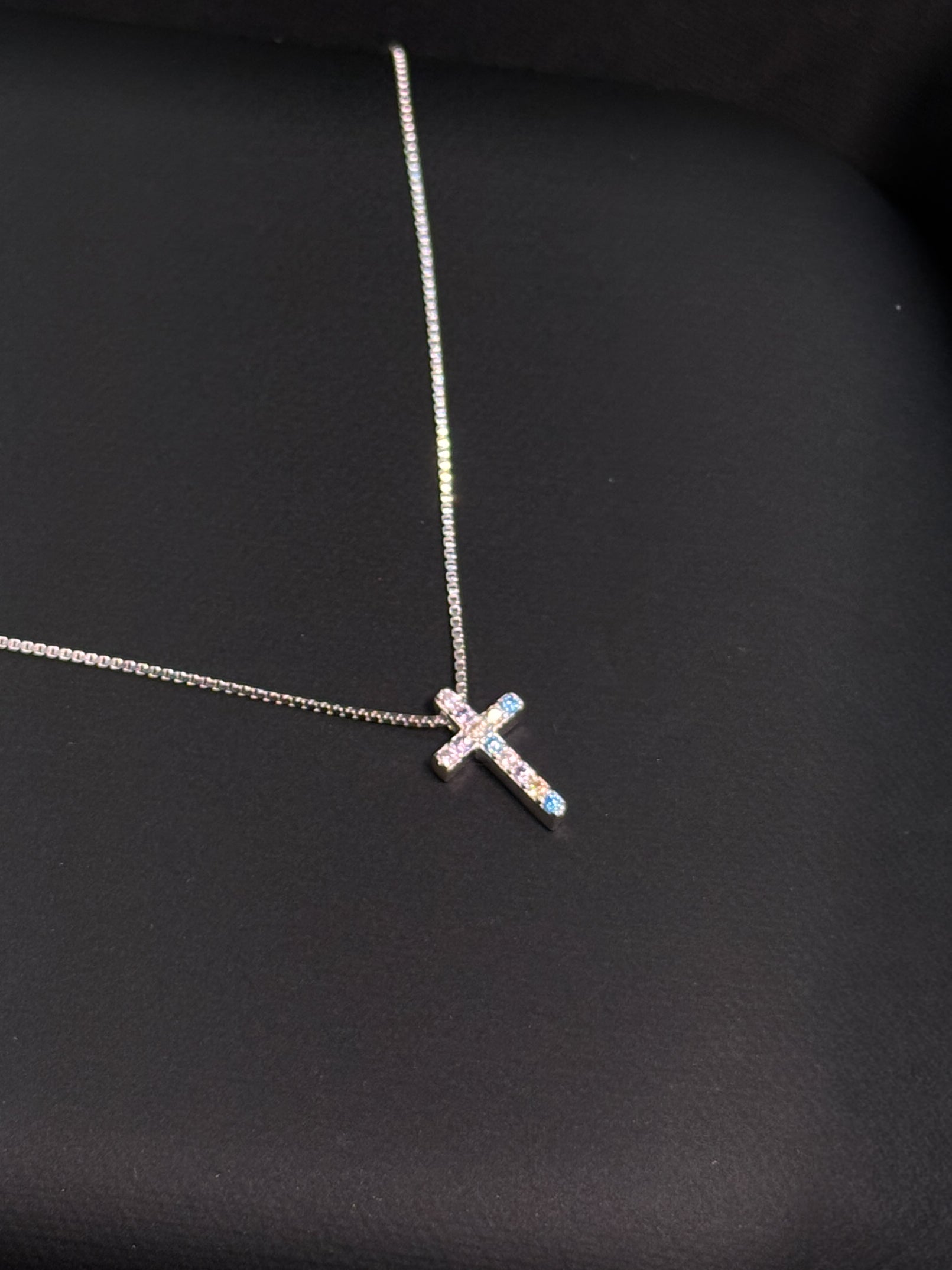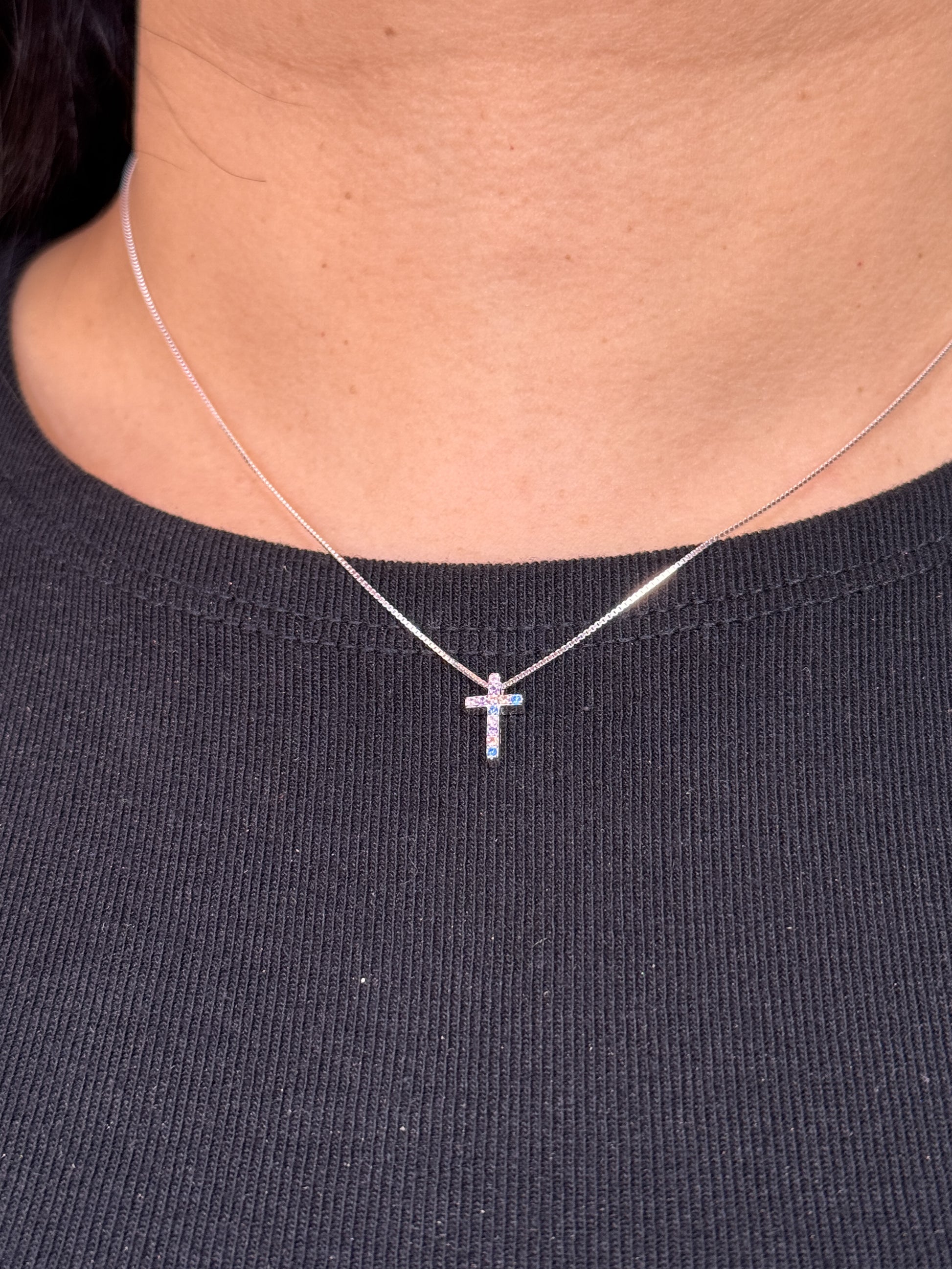 Cadena tipo aguja graduable, dije cruz microcircones multicolor, plateado, azul y rosa