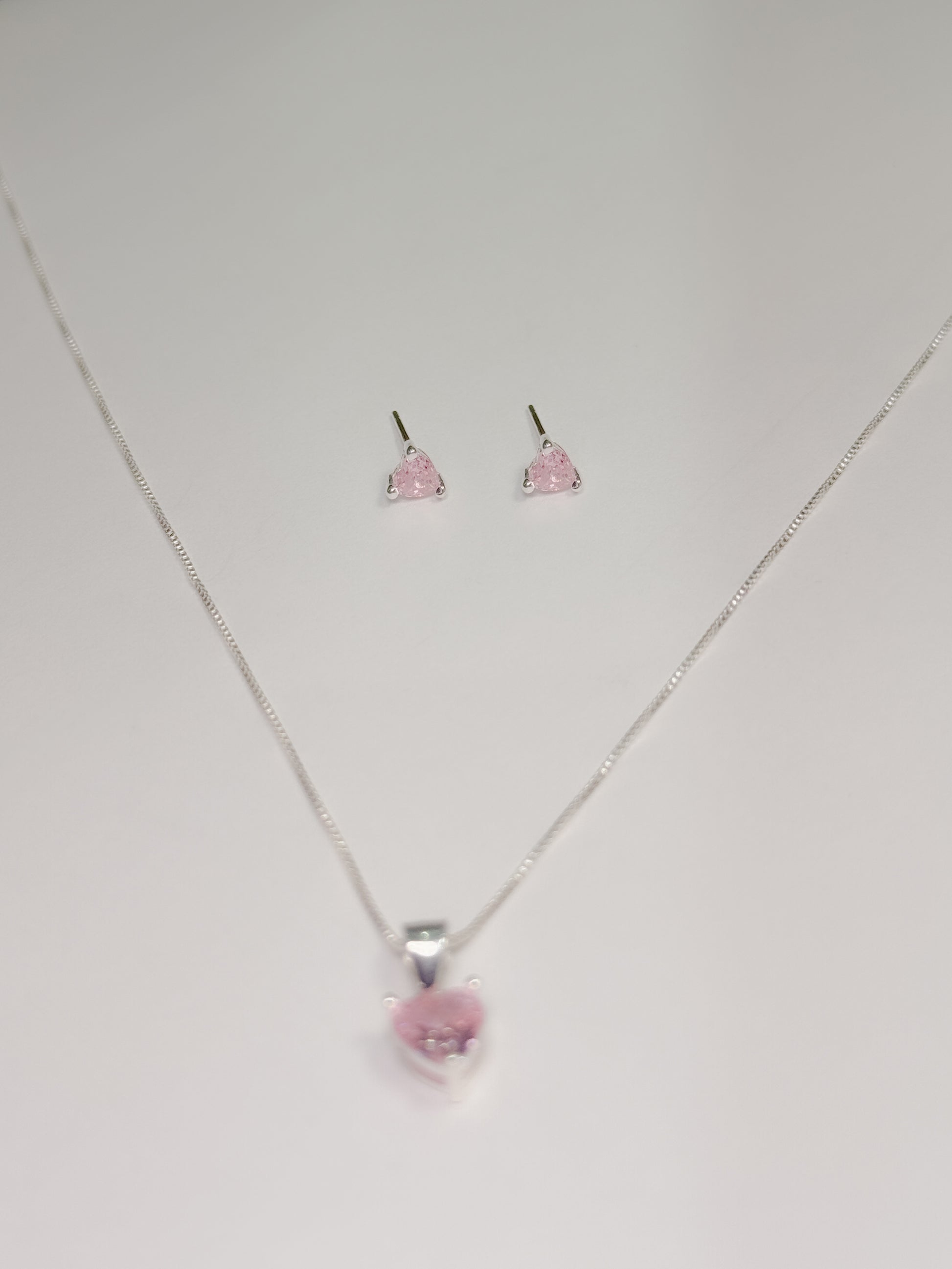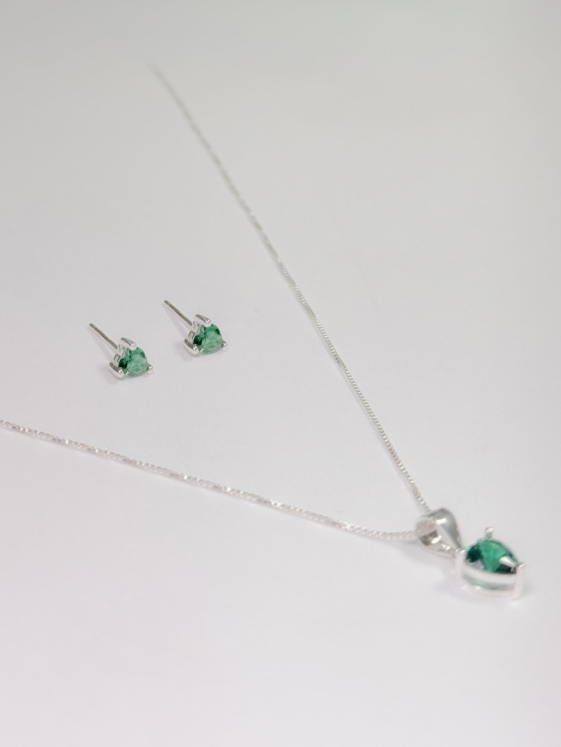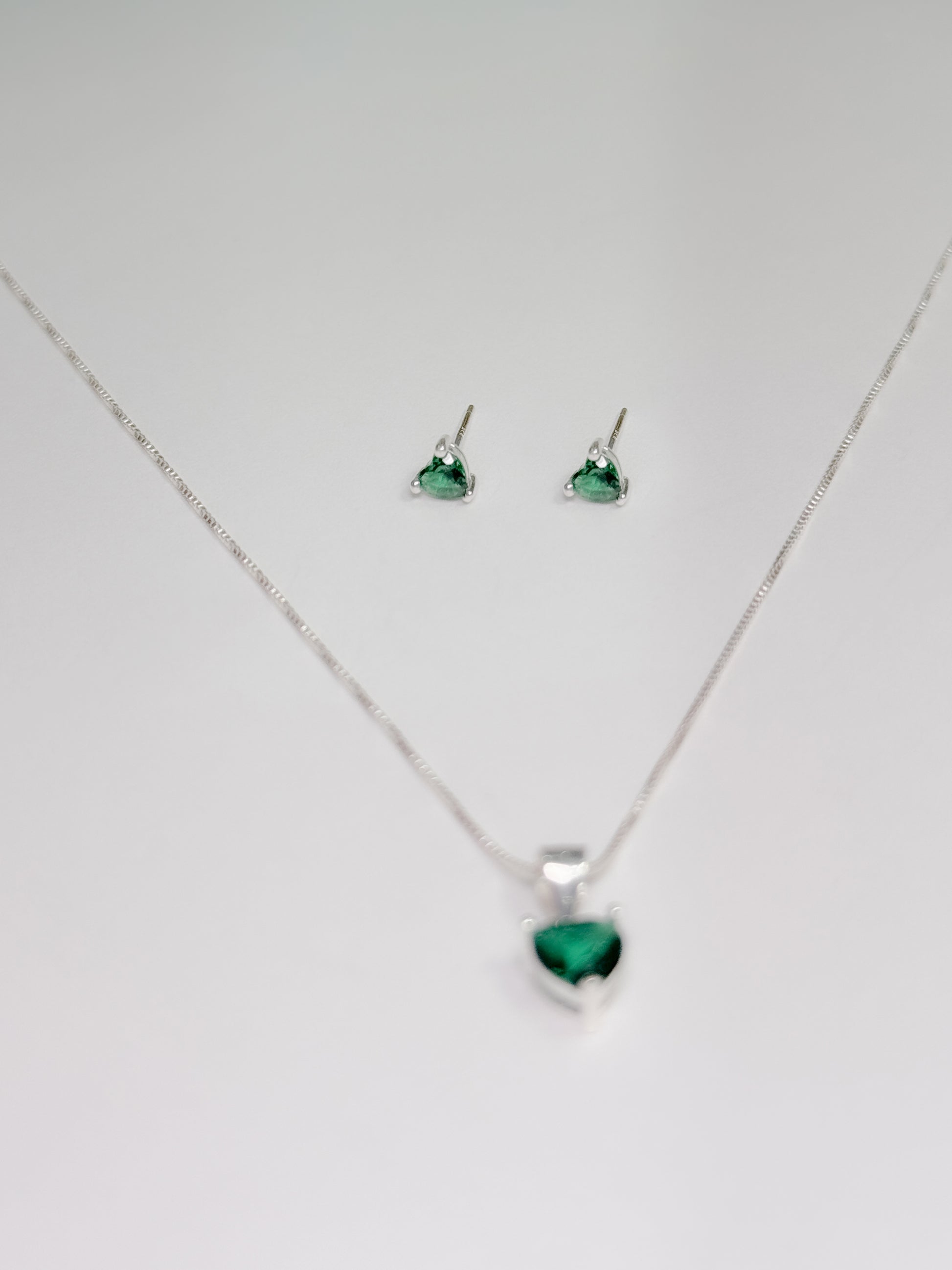 Juego en plata con dije de brillante en corazón rosa y verde esmeralda (collar+cadena+topos)
