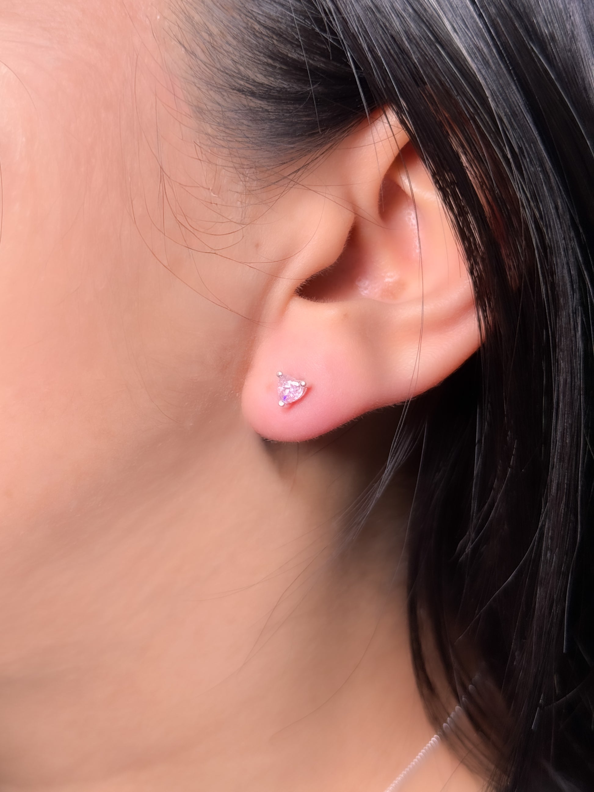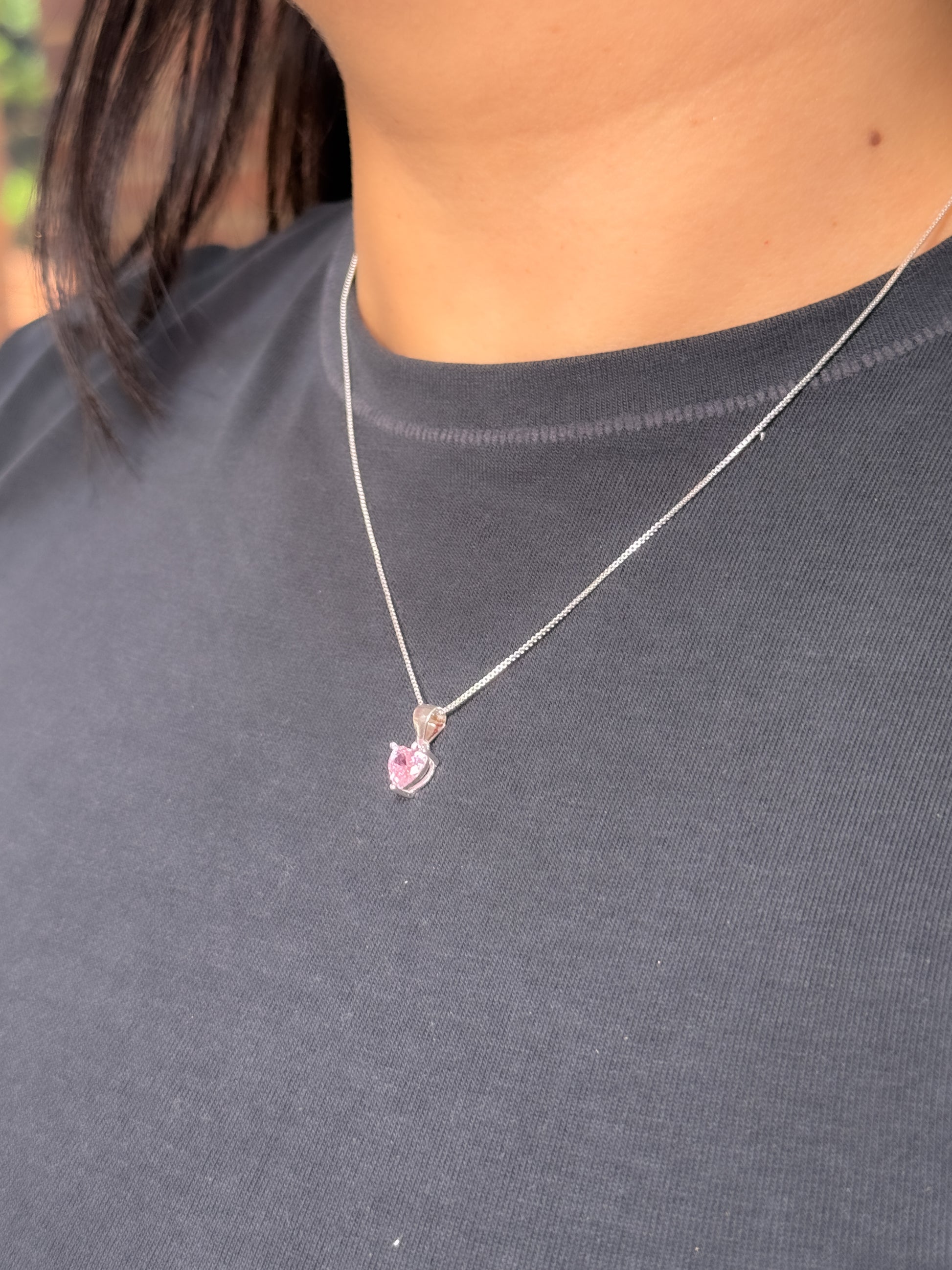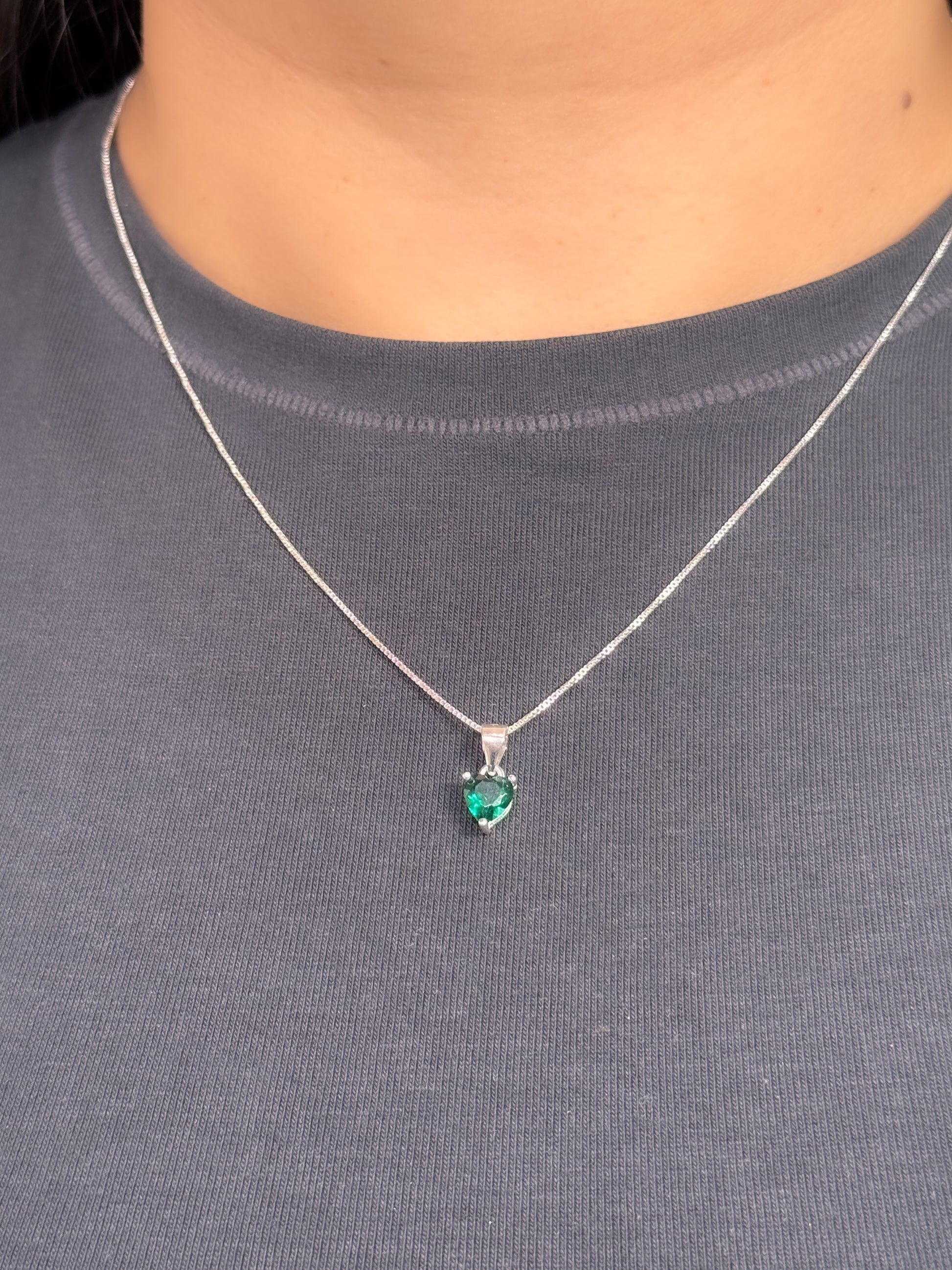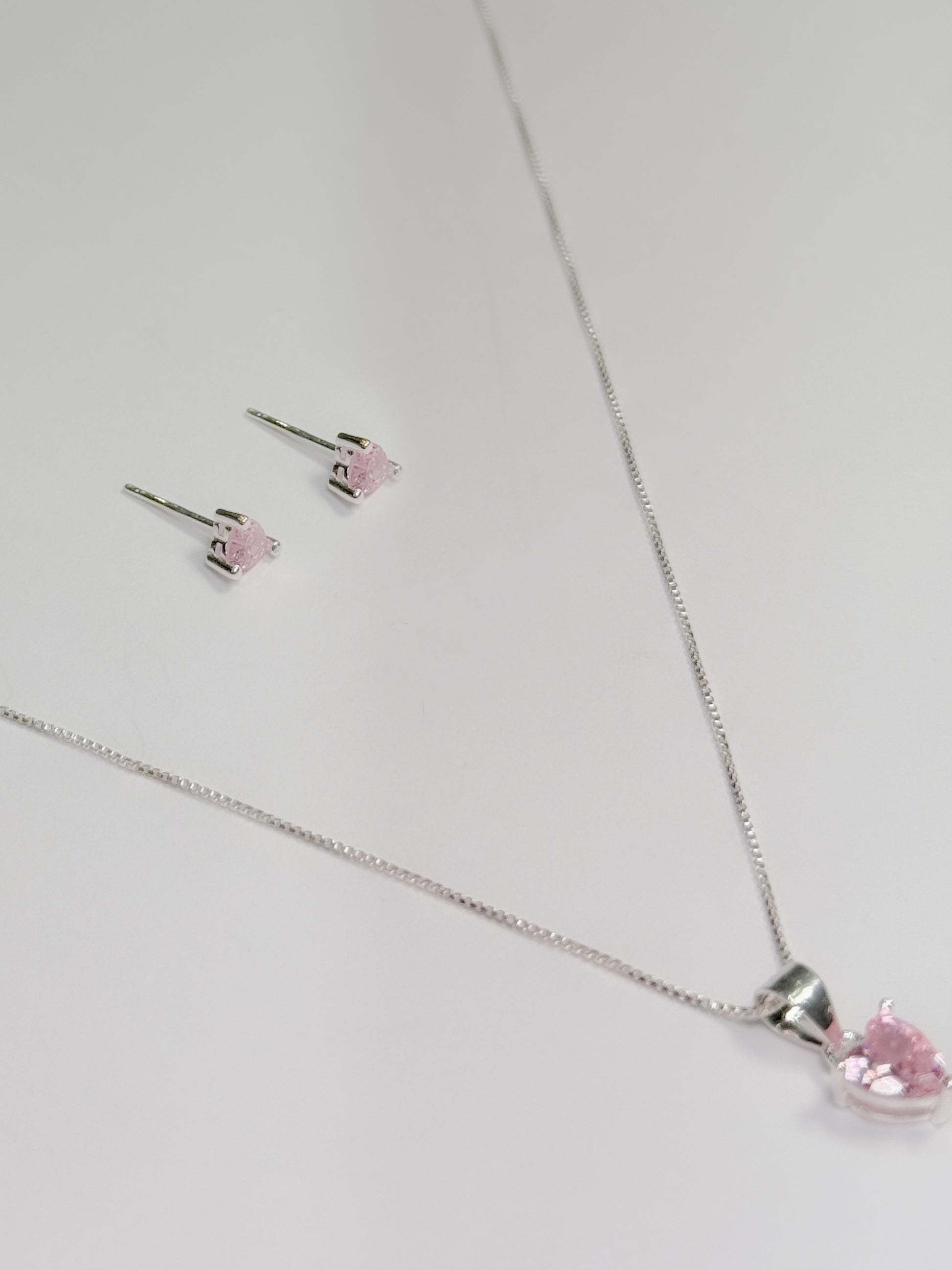 Juego en plata con dije de brillante en corazón rosa y verde esmeralda (collar+cadena+topos)