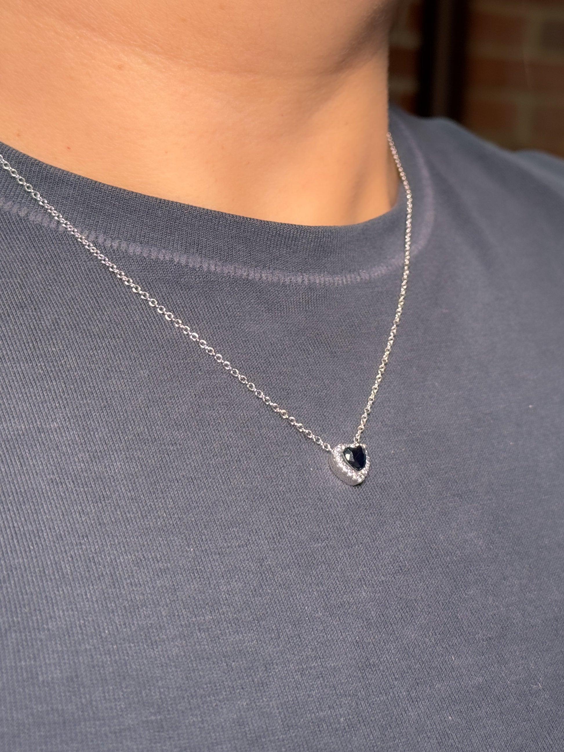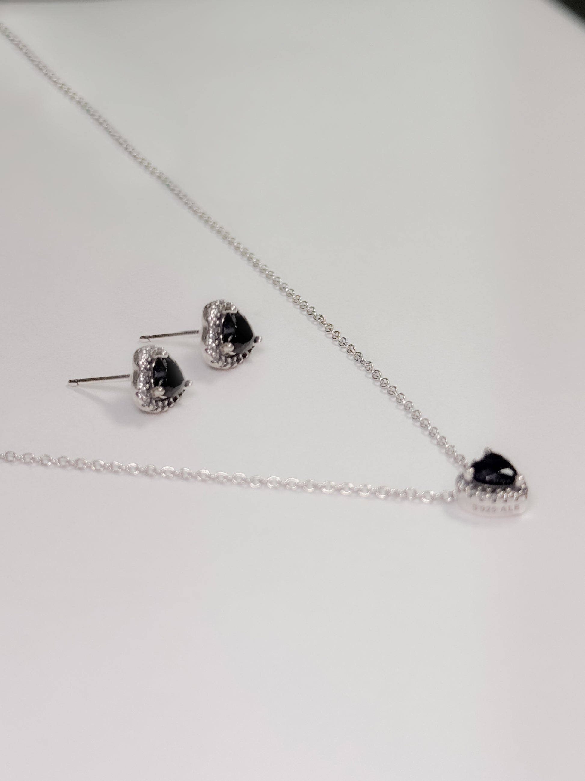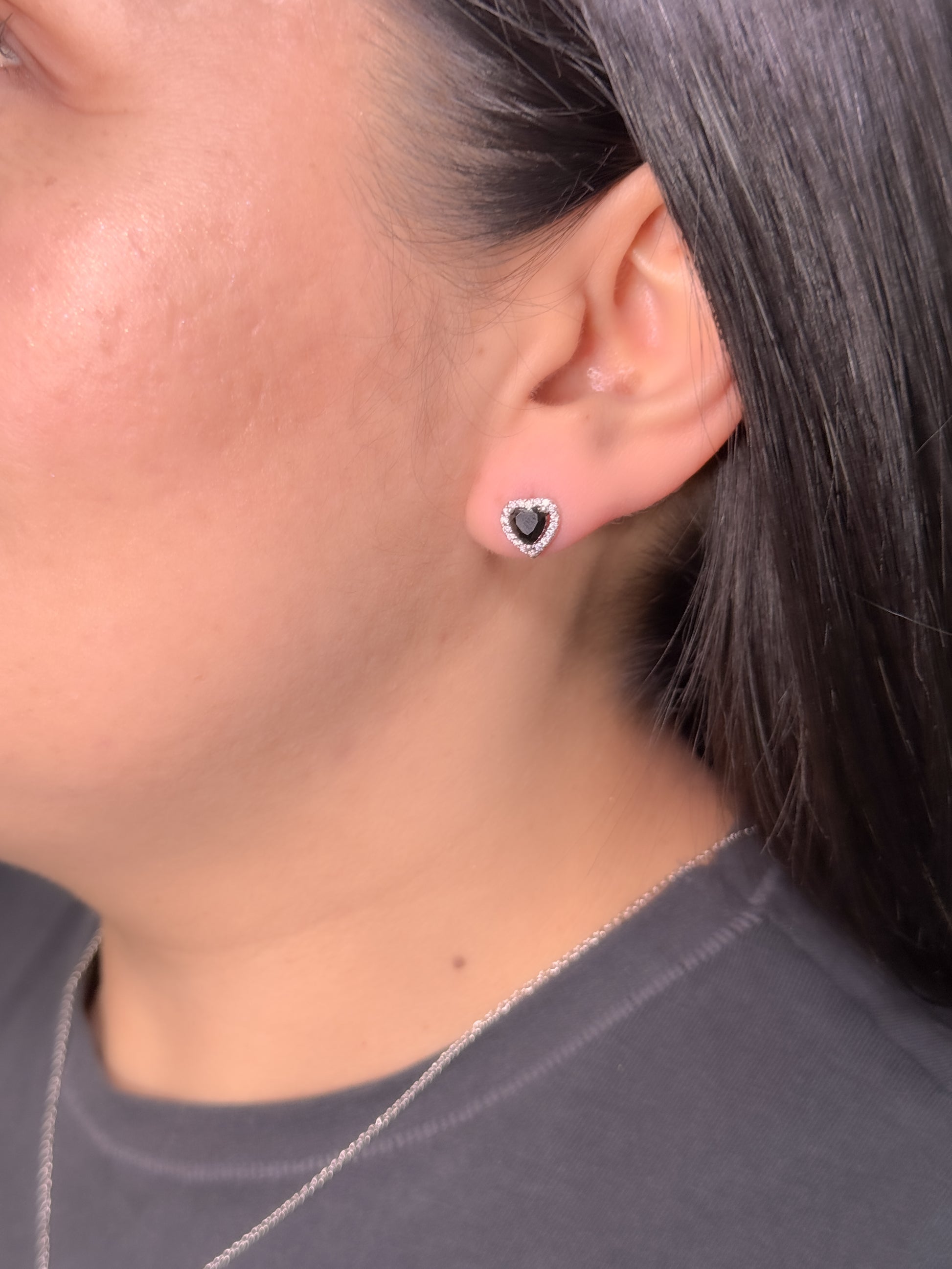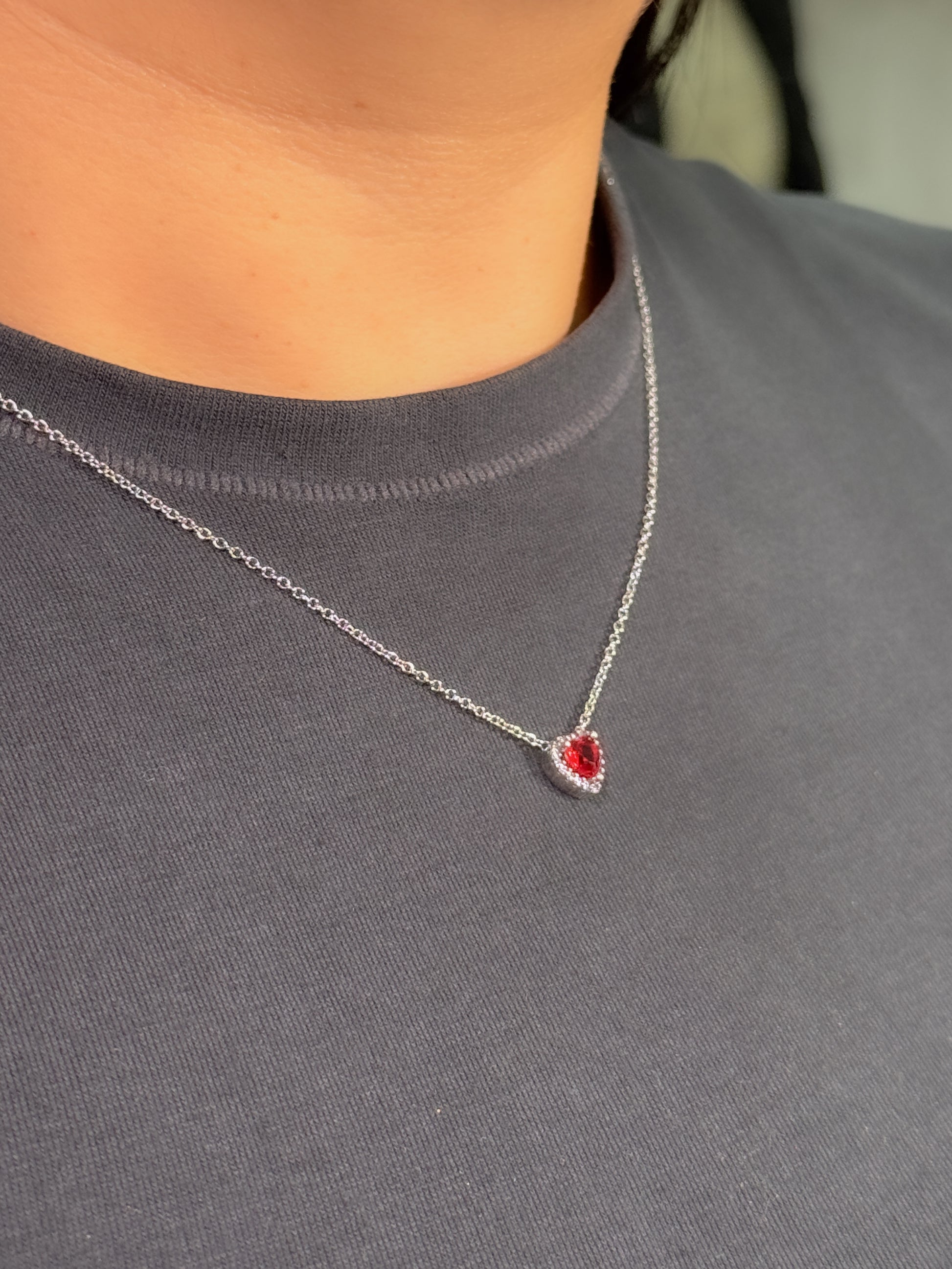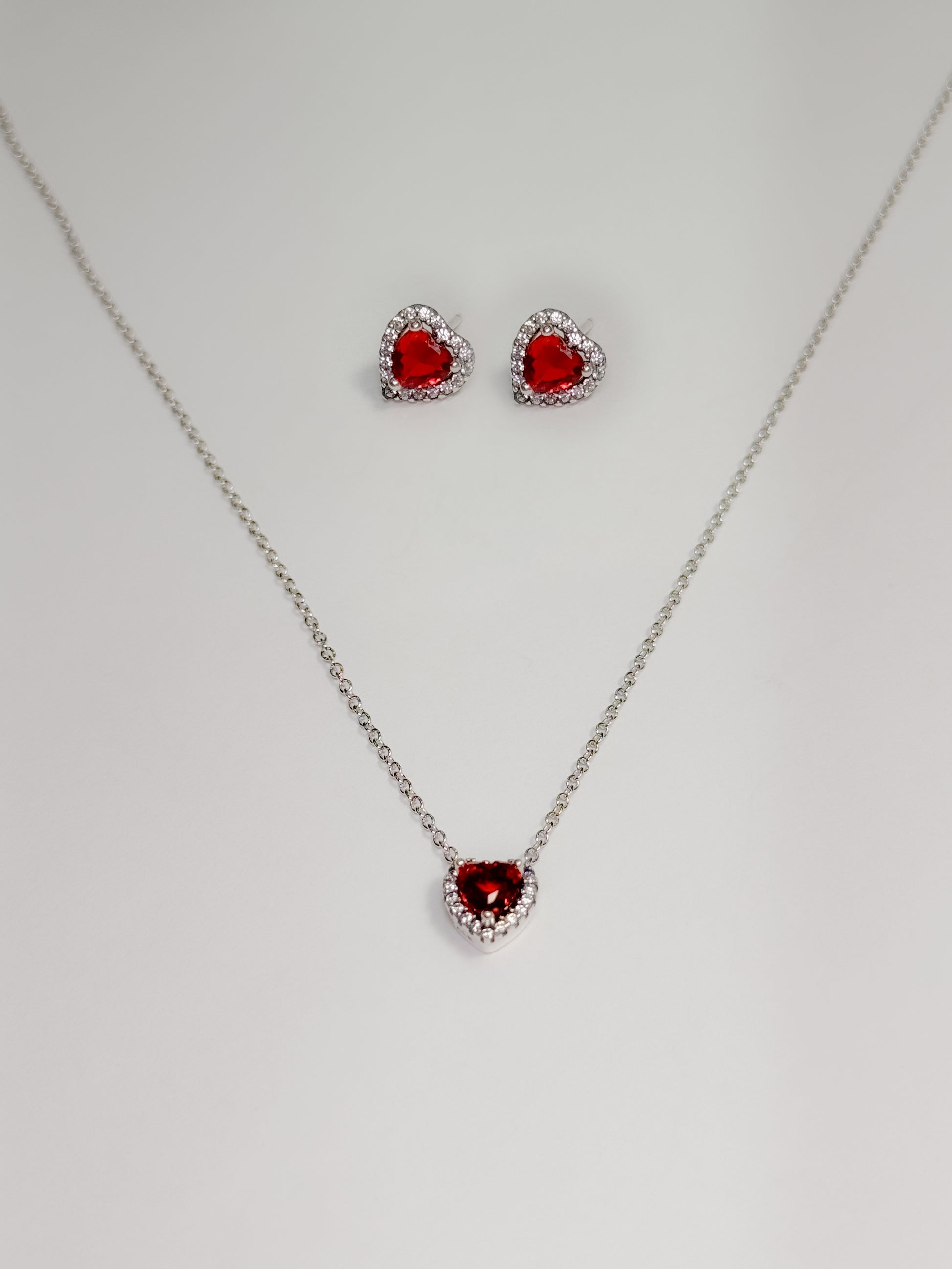 Juego en plata ley 925 con dije de corazón rojo o negro con marco en brillantes blancos (collar+cadena+topos)