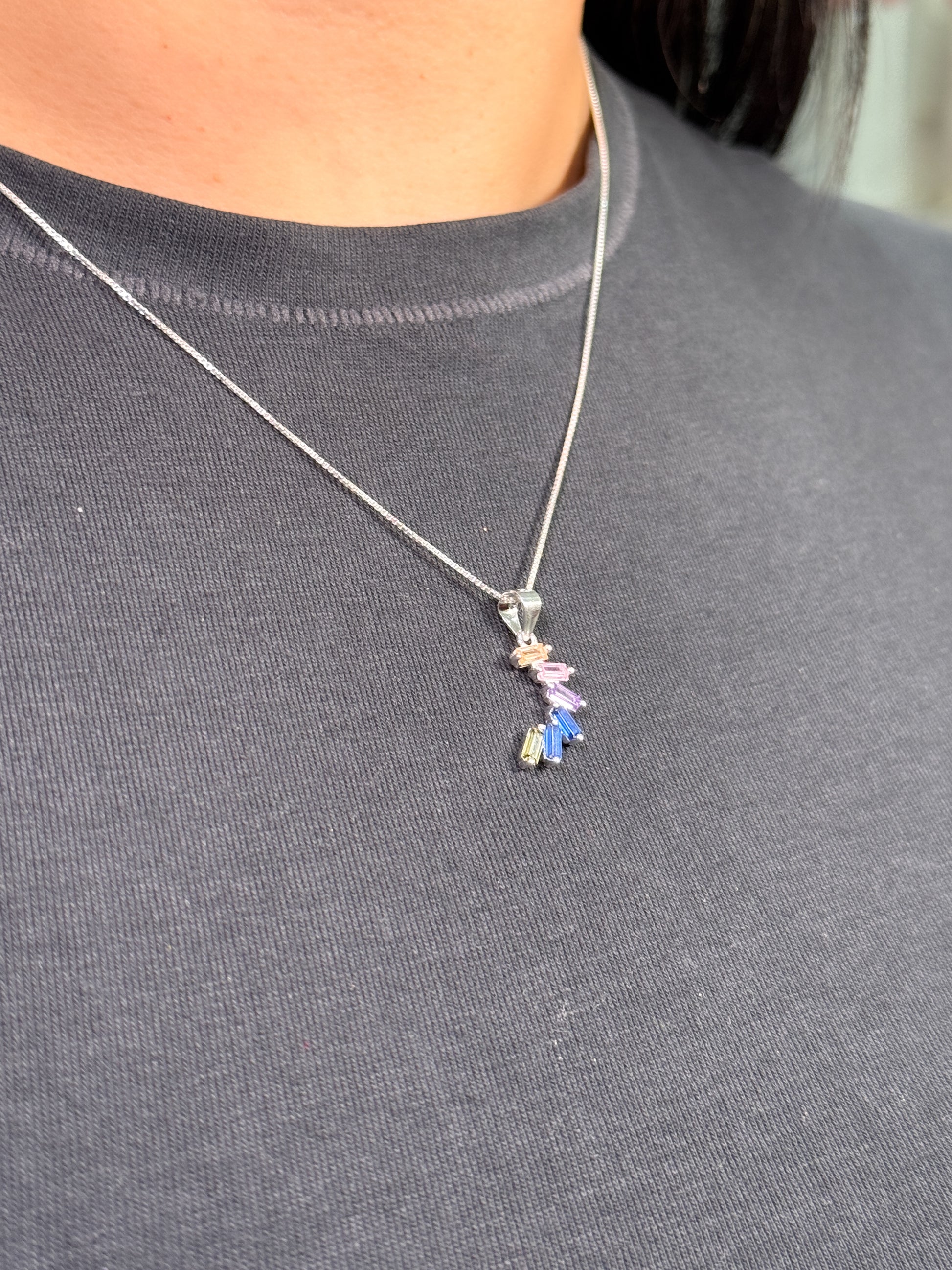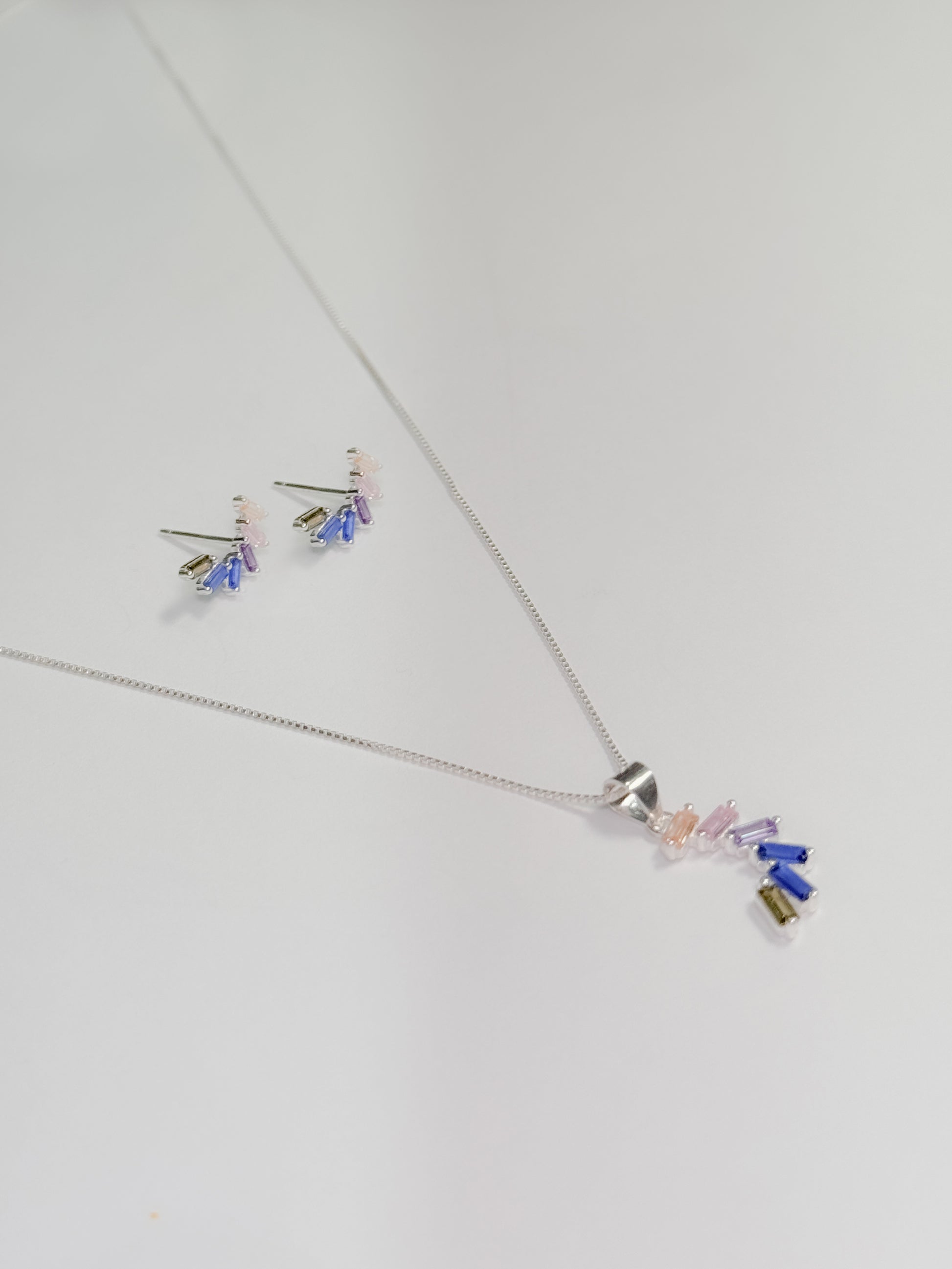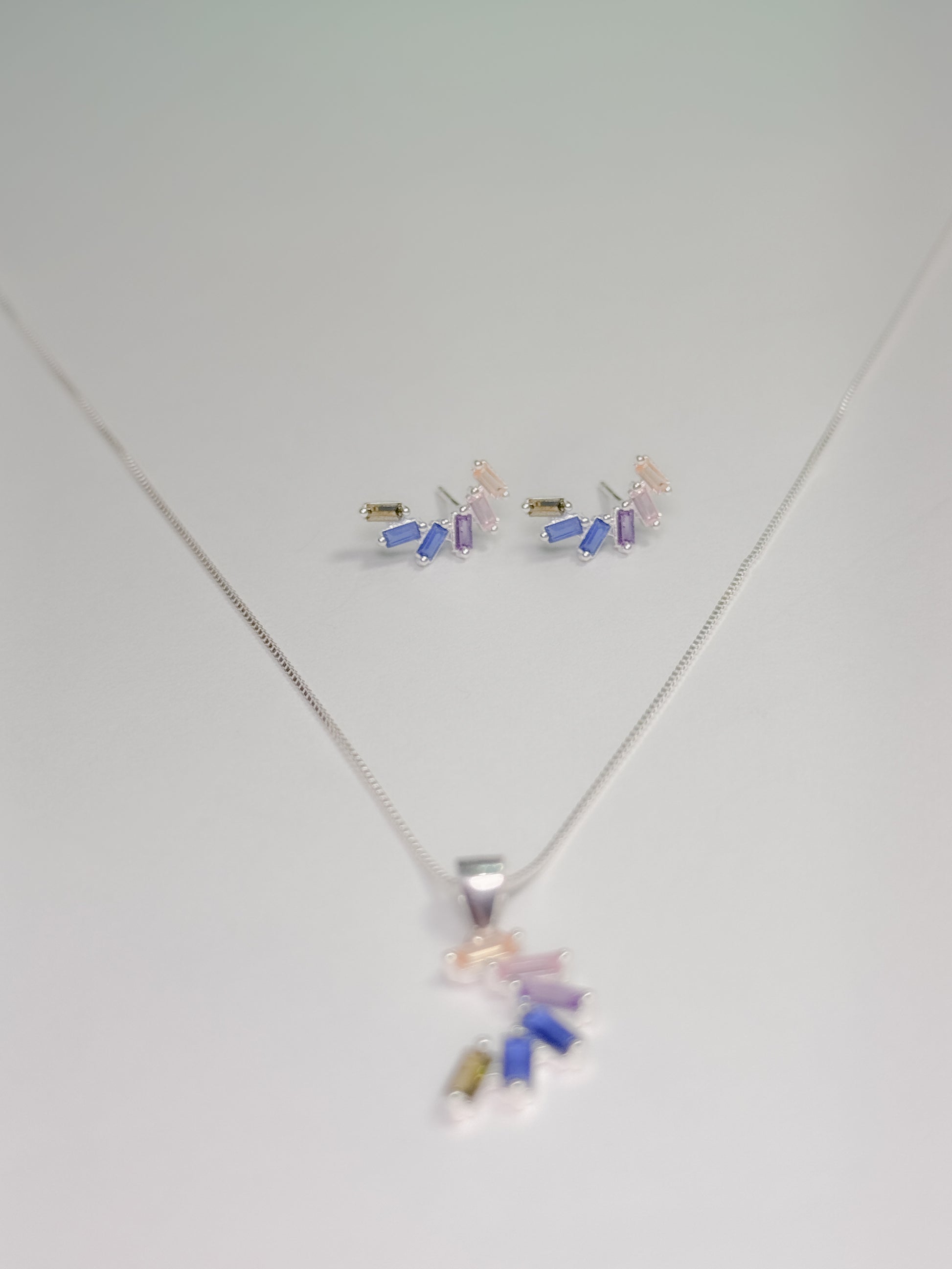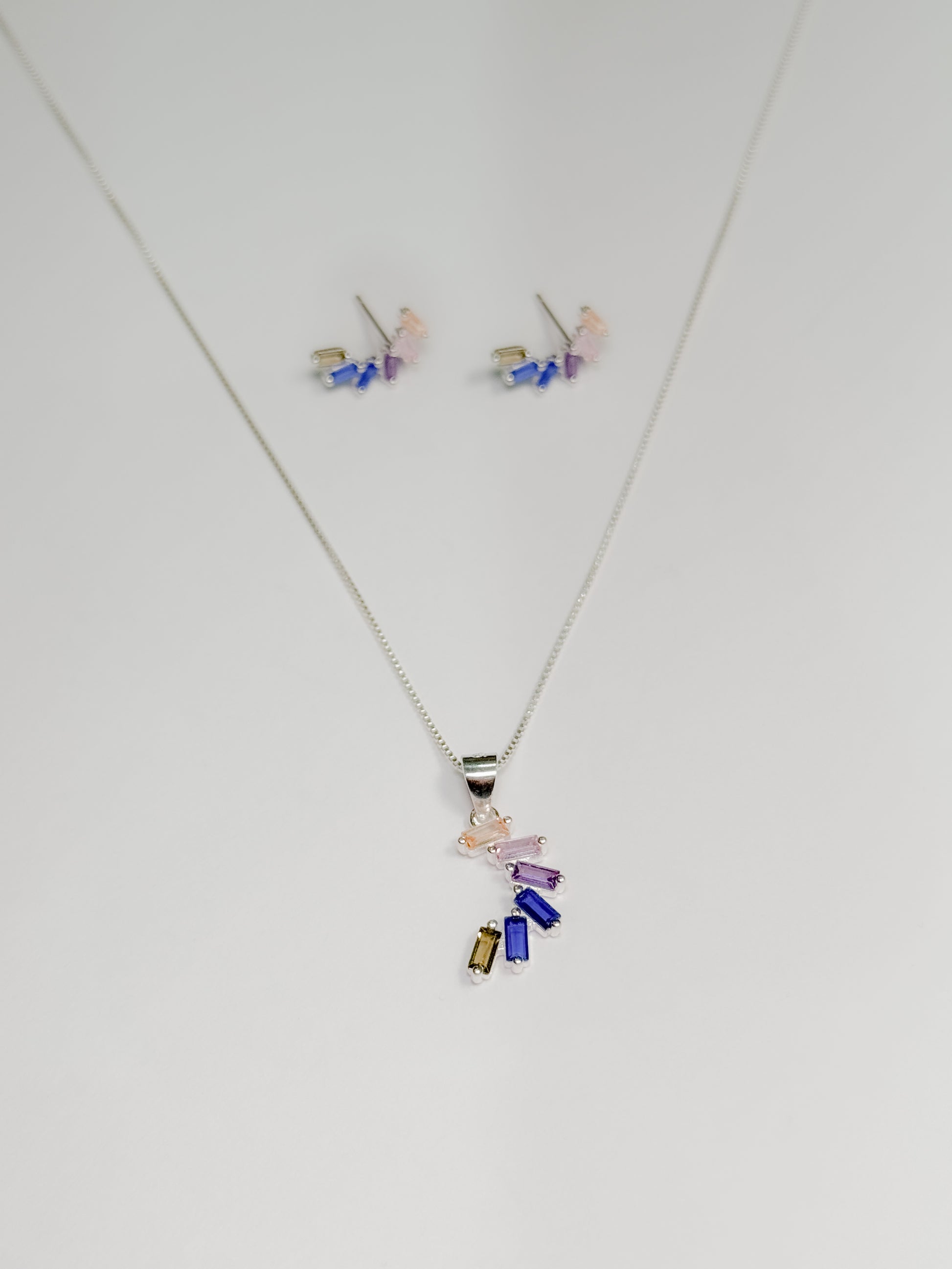 Juego en plata ley 925 con dije en piedras baguette multicolor (collar+cadena+topos)