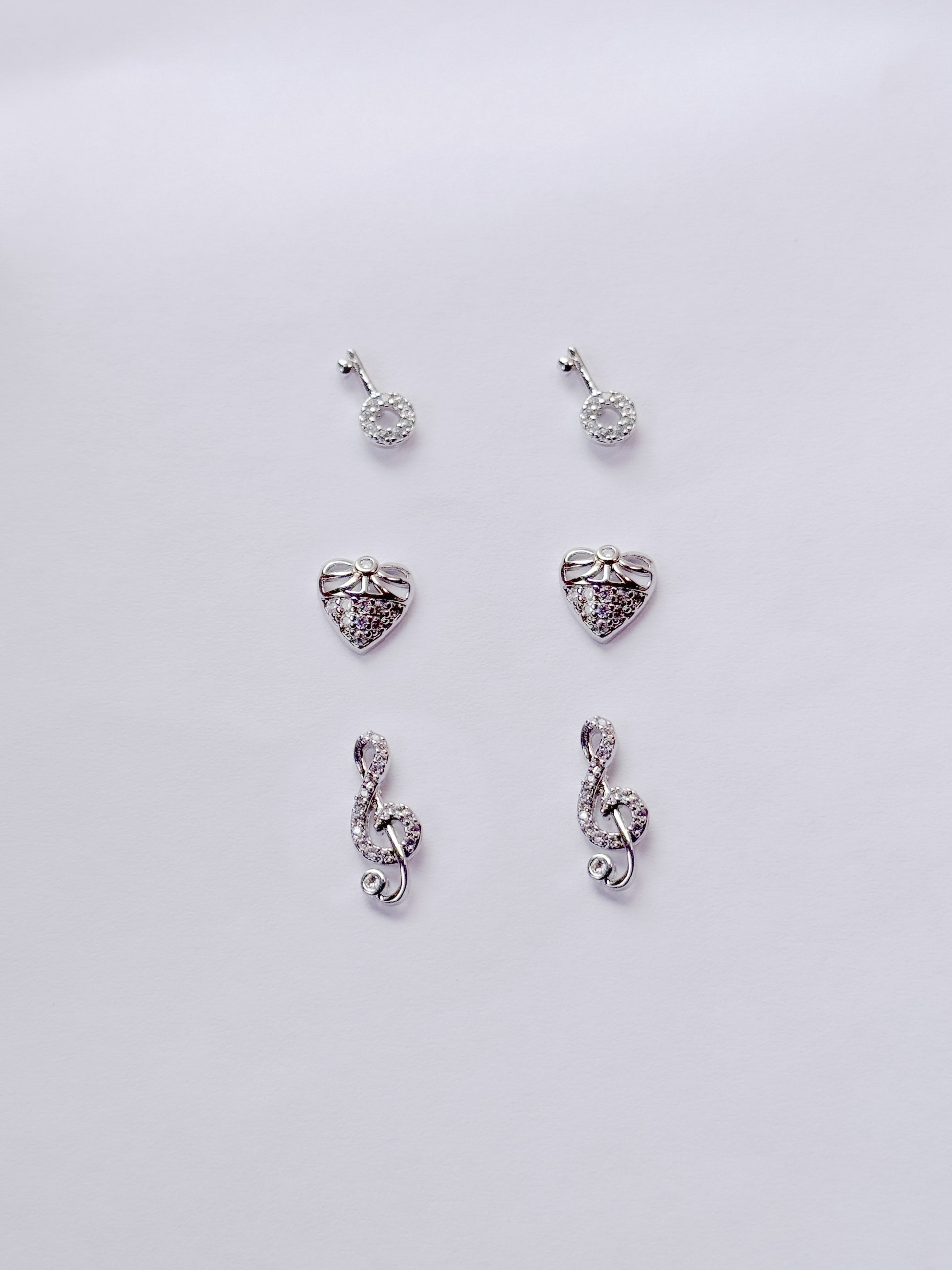 Set x3 (3 pares de topo) topos llaves, corazón y nota musical plateado